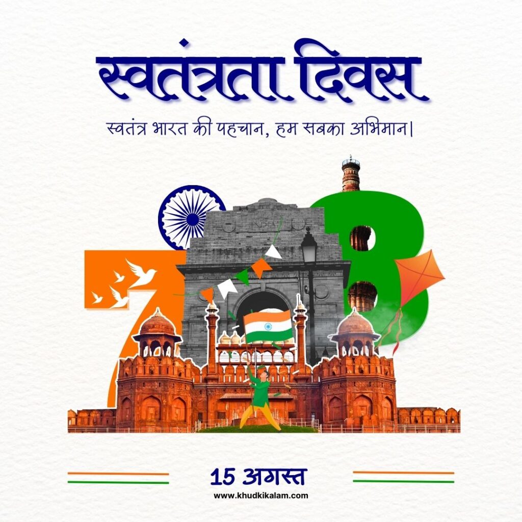 15 अगस्त का दिन सम्पूर्ण भारत वाशियो के लिए एक गौरव का दिन माना जाता है , हर वर्ष की आने वाली 15 अगस्त (15 august ) को सम्पूर्ण भारत में बड़े जश्न के साथ स्वतंत्रता ( आजादी ) के दिन को मनाया जाता है , वर्ष 1947 की 15 अगस्त को आधिकारिक तोर पर भारत ने आजादी हासिल की थी उसी दिन से आज तक लगातार इस वर्व को मनाया जाता है , और स्वतंत्रता या आजादी दिलाने में जो बलिदान हुए , जिस ने वतन के लिए अपने प्राण त्याग दिए उन आजादी के दीवानो , स्वतंत्रता सेनानियों को याद किया जाता है एक दूसरे को आजादी की या स्वतंत्रता दिवस की शुभकामना संदेश in Hindi में दी जाती है , देश भर में इस दिन स्कुल , कॉलेज , और सार्वजानिक संस्थानों में सेलिब्रेशन किया जाता है ऐसे सांस्कृतिक प्रोग्राम का रूप दिया गया है प्रोग्राम में स्वतंत्रता दिवस पर कविता शायरी , नाटक आधी कलाओ के साथ शौर्य सक्ति का प्रदर्शन भी किया जाता है ,