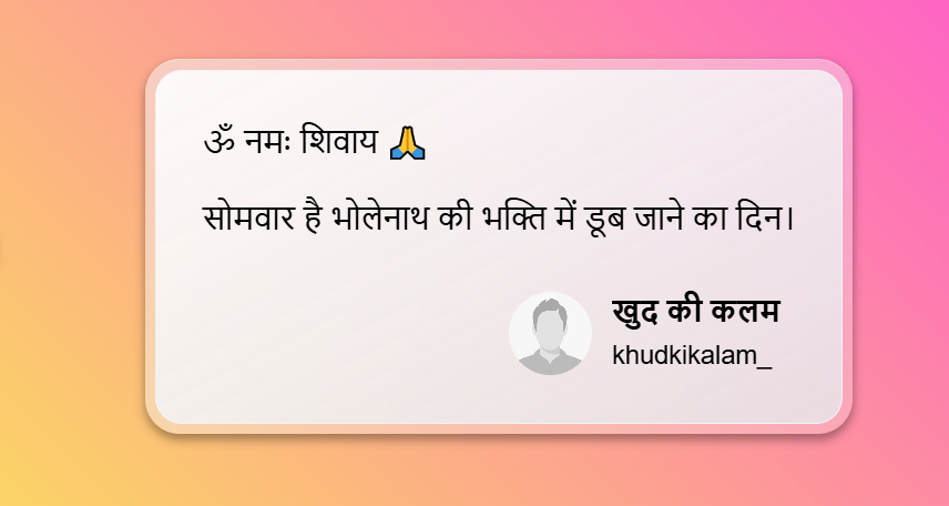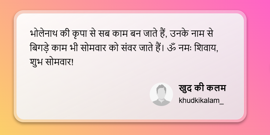 शुभ सोमवार के दिन की पावन सुबह पर लोग अपने दोस्तों और परिवार को यादगार संदेश भेजते हैं, इसलिए यहाँ हम आपके लिए Good Morning Monday Shayari in Hindi, सुंदर Monday Suvichar in Hindi, और खास Monday Quotes in Hindi लेकर आए हैं। आप इस सोमवार को इस दिन को और मंगलमय बनाने के लिए लोग महादेव शुभ सोमवार और ॐ नमः शिवाय लिखकर शुभकामनाएँ देते हैं, सोशल मीडिया पर Shubh Somwar ShareChat स्टेटस, Monday Good Morning Wishes in Hindi, शिवरात्रि शायरी और शुभ सोमवार स्टेटस इमेज बहुत पसंद किए जाते हैं। अगर आप सप्ताह की सकारात्मक शुरुआत करना चाहते हैं, तो इन प्रेरणादायक Shubh Somwar in Hindi संदेशों और शायरी को जरूर शेयर करें।
